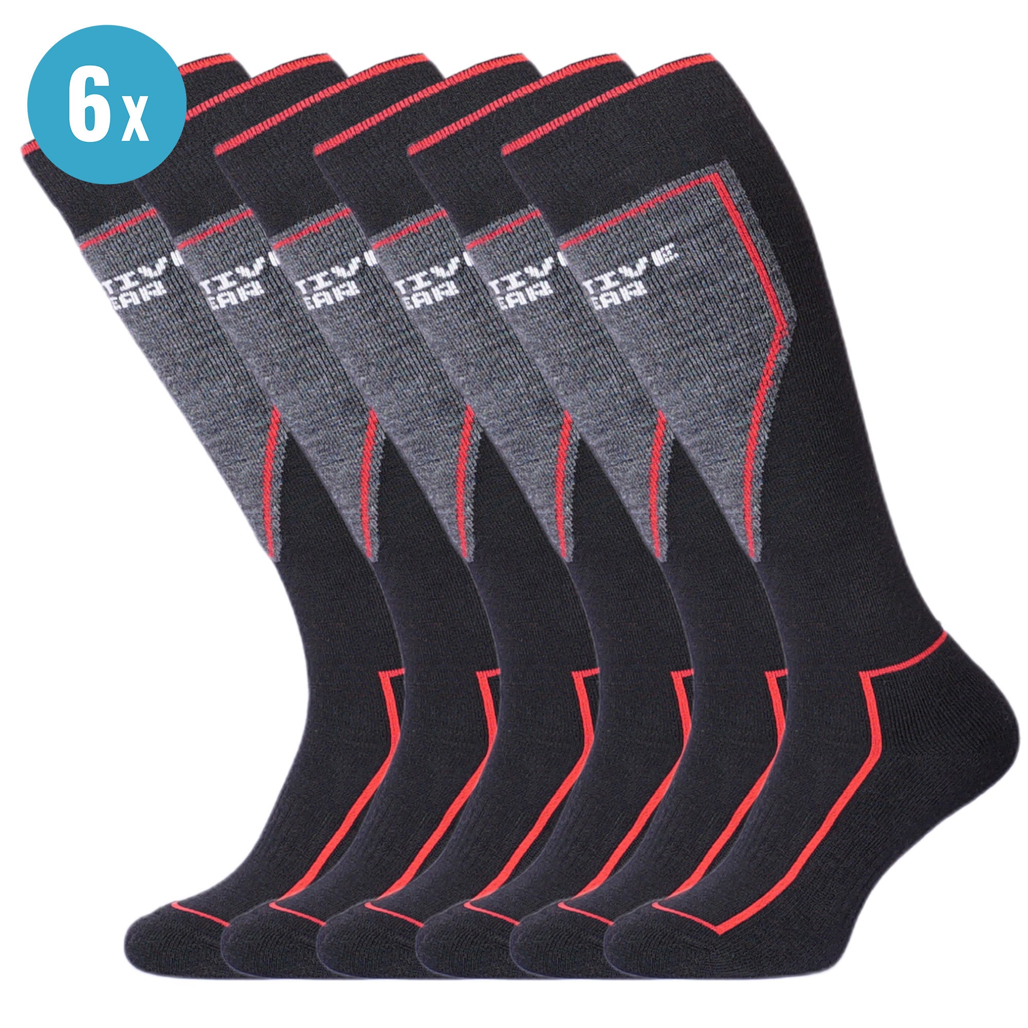 94Activewear Outdoor- en Skisokken Merino Wol Zwart/Rood 6-Paar is de complete seizoen voorraad voor iedereen die veel buiten is in de kou. Met zes paar in één set heb je altijd een schoon, droog paar klaar liggen, ideaal voor een volledige week wintersport, meerdere koude zeildagen achter elkaar, bemanningsleden aan boord of gewoon als vaste voorraad in de kast. De sokken zijn gemaakt van premium Merino wol, dat warmte vasthoudt en vocht snel afvoert. Daardoor blijven je voeten langer warm en minder klam, ook als je intensief beweegt in skischoenen, zeillaarzen, neopreenlaarzen of hoge winterboots. De nauwsluitende pasvorm om voet en onderbeen voorkomt afzakken en draaien, terwijl Merino wol van nature geur remmend werkt, wat juist bij meerdaags gebruik in koude, vochtige omstandigheden extra prettig is.